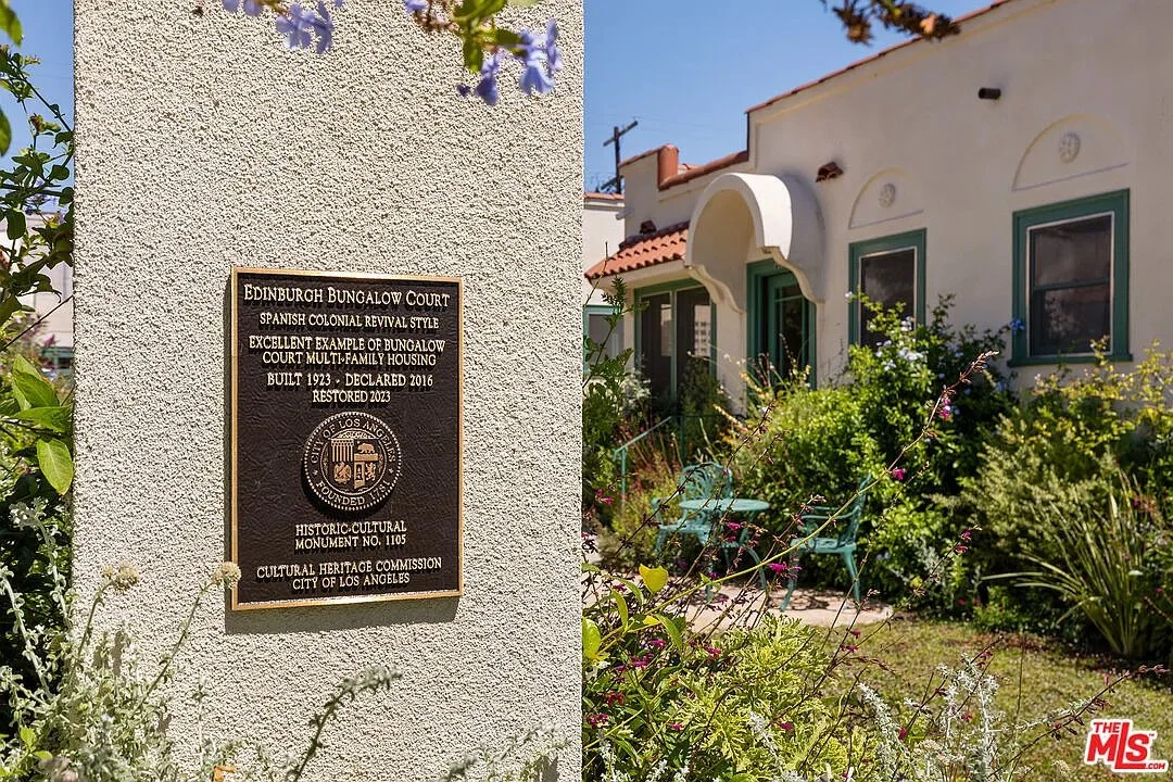 The historic Edinburgh Bungalow Court is a designated Los Angeles Historic-Cultural Monument and recipient of the Los Angeles Conservancy's 2023 Preservation Award. The property consists of four structures each with two side-by-side 1BD/1BA residences (approximately 532 sq ft each)arranged around a serene, gated courtyard. Six garages (with 220V plug for EV charger), two surface parking spaces, and a bonus studio unit near the garages ideal as a shared community room, office, or creative space complete the offering.