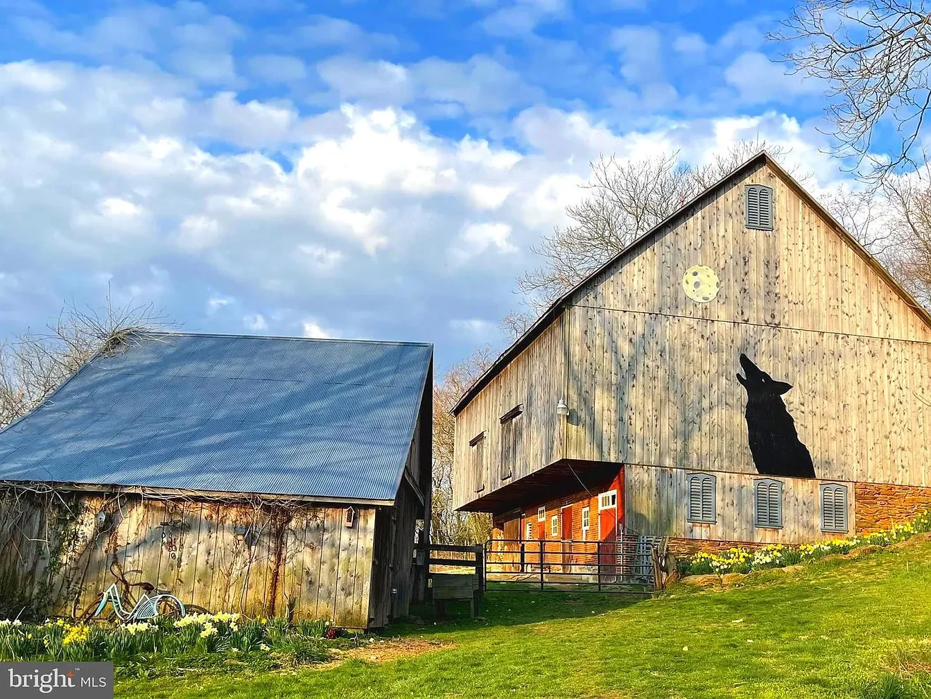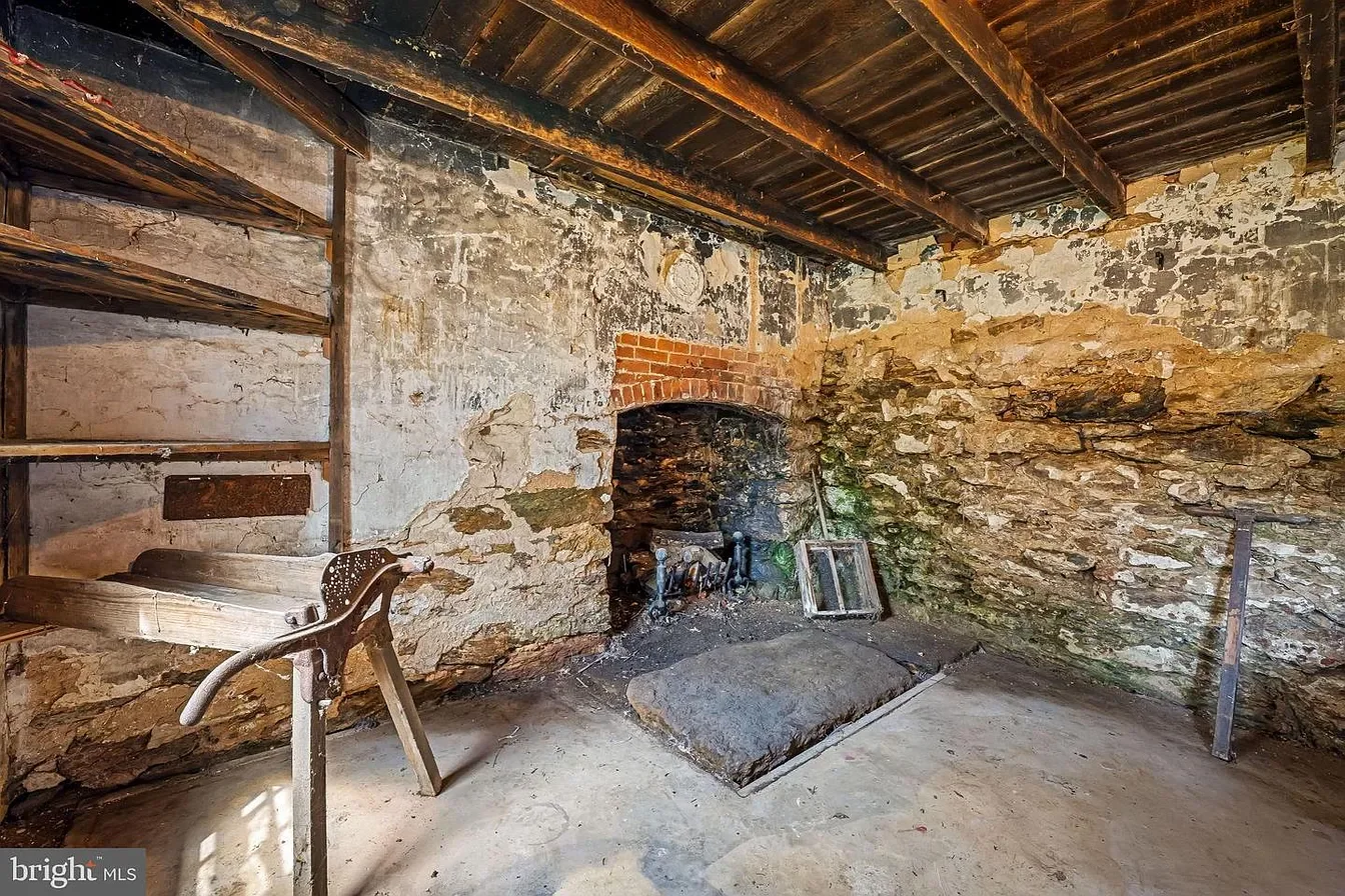 The large 1880s bank barn features hand- and machine-hewn beams and stone walls. A separate three-bay barn provides additional covered storage. The 1880 farmhouse was re-roofed with lifetime architectural shingles. The property includes approximately 1½ acres of flat, fenced pasture currently suited for alpacas and easily adaptable for goats, sheep, or other small livestock. A spring house with an underground spring, root cellar, smoke house, and original stone summer kitchen enhances both function and authenticity.